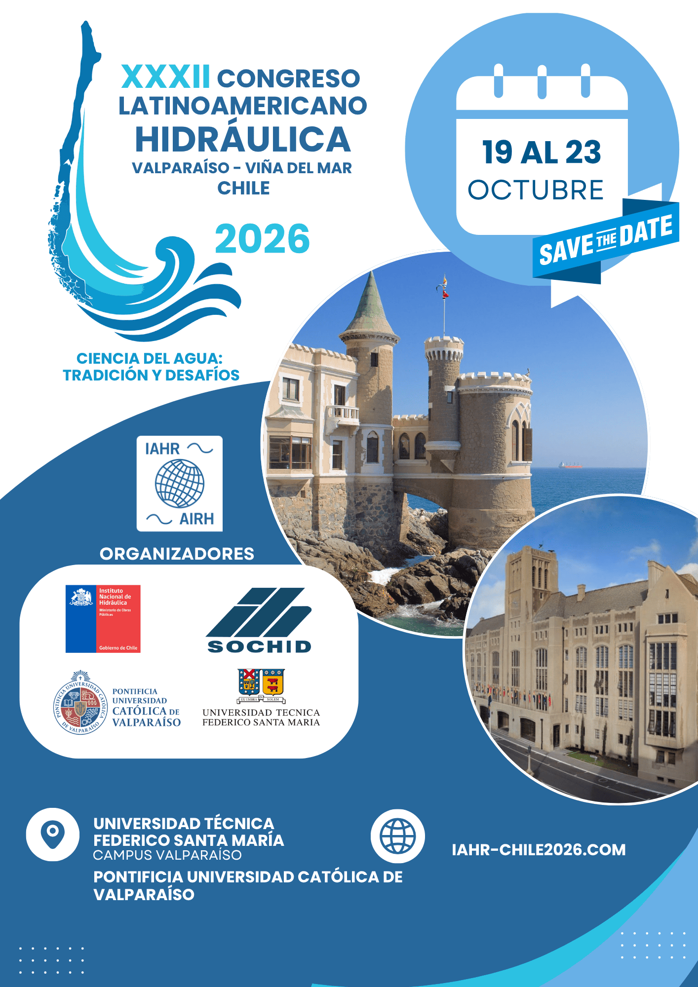El evento más importante para la comunidad técnico científica del agua en Latinoamérica. El XXXII Congreso Latinoamericano de Hidráulica, se desarrollará en Valparaíso y Viña del Mar del 19 al 23 de octubre de 2026. Los esperamos a todos!